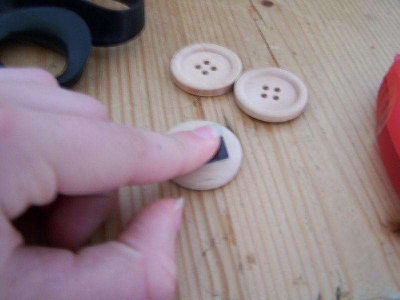 Plak een stukje dubbelzijdig plakband op de niet-magnetische kant van het stukje magneetvel. Of ga er met de pritt-roller overheen. Het is niet handig om voor deze stap gebruik te maken van een lijmpistool, want hierbij kan de lijm door de gaatjes naar de andere kant van de knoop komen en dat zie je dan als het magneetje af is.
